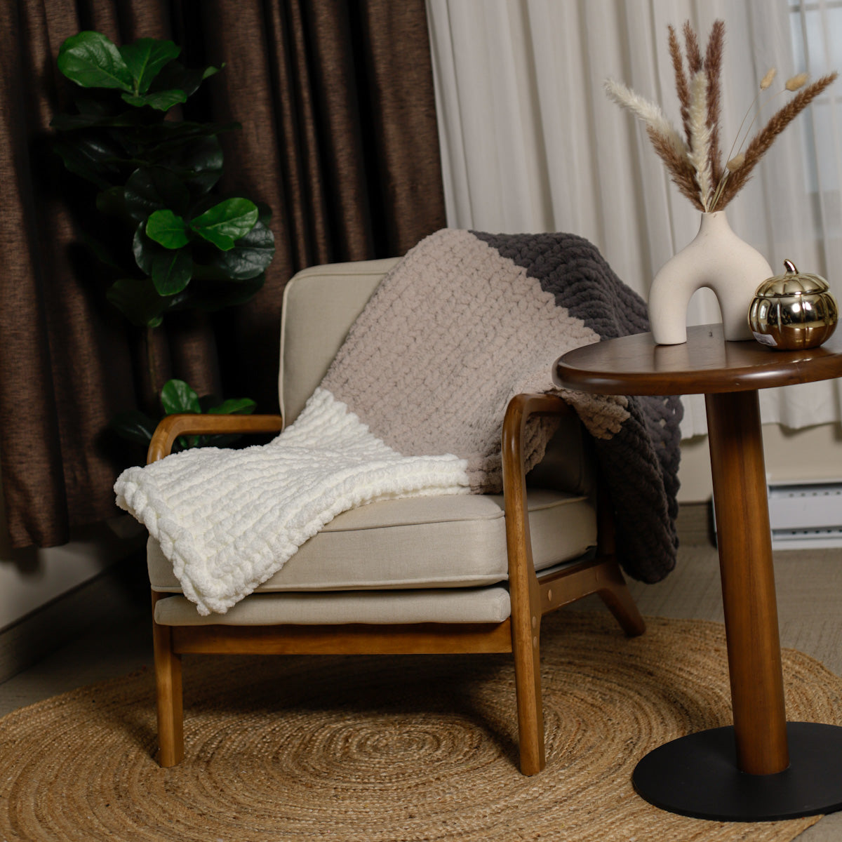 Couverture “Ombré Tricolore” – Tricotée à la main sans aiguilles